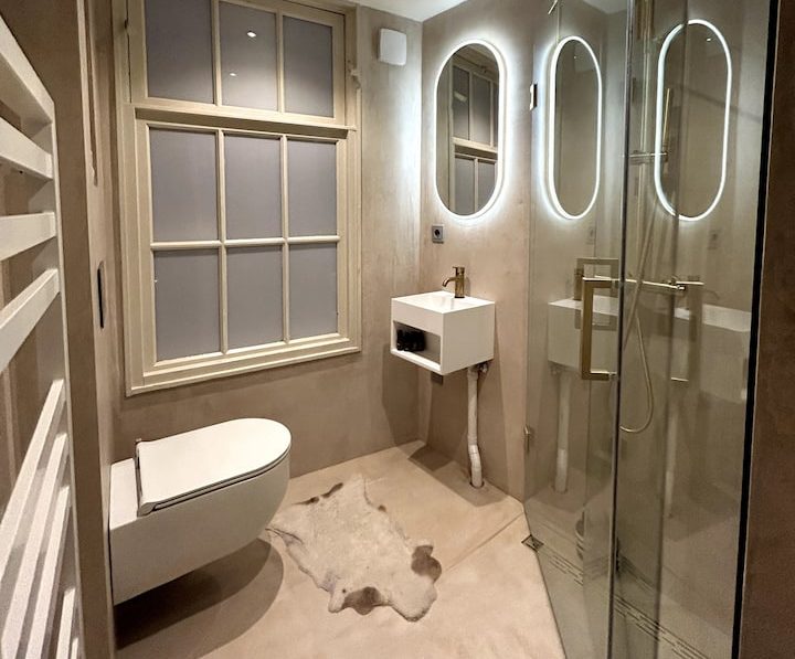 Das Tageslichtbad glänzt mit modermer Ausstattung und einer bodentiefen Glasdusche. Hochwertige und duftende Wellnessutensilien runden das Badeerlebnis ab.